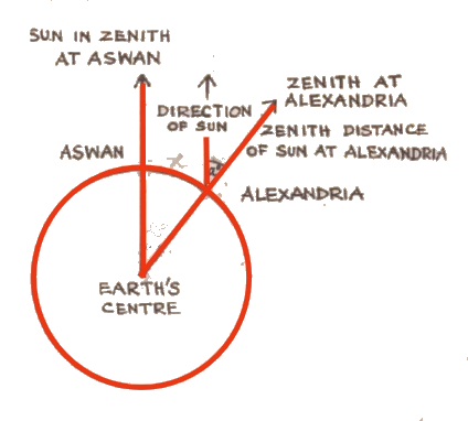 Now we can describe how Eratos thenes measured the earth. He lived in Egypt and he noticed that the sun was in the zenith at Aswan at noon on a certain day. On the same date at the same time he measured the angle bet ween the sun’s rays and the zenith (called the zenith distance of the sun) at Alexandria . He thus got a figure like this