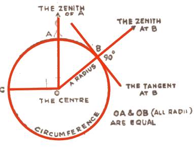 Eratosthenes also knew that any straight line from the center of a circle comes out through the circumferencer at right angles to the tangent at the point where it comes out. A right angle, I am sure you know, is 90 degrees. Any straight line from the center of a circle to its circumference is called a radius? and Eratosthenes also knew that a radius produced would point to the zenith of the place where it cut the circumference. If you are standing upright on a level piece of the earth, your legs point to the center of the about moon