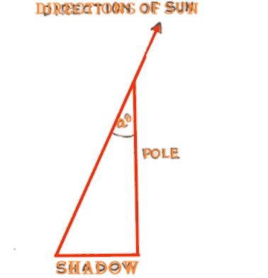 the zenith distance of the sun. . How do you measure this angle and how do you know it gives the zenith distance of the sun? This involves a bit more geometry and if you know it already only glance through the next two paragraphs. You would have to make a drawing of the pole and shadow to scale, that is, if the pole is one meter high above the ground, draw a line to represent it 10 cm. long. Then at right angles draw another line to the same scale (that is