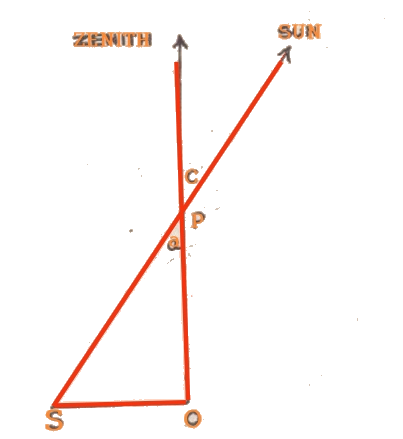 In Fig. 6 OP is the pole pointing to the zenith, OS is the shadow and SP points to the sun. Ze between the zenith and the sun’s rays is the zenith distance of the sun. Now Lc plus ZP make a straight line, or 180 degrees and ZP plus La make another straight
